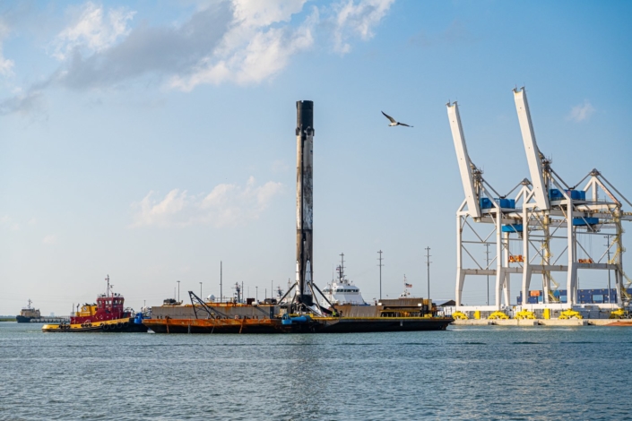 Après 9 minutes et 30 secondes de vol, l’étage était revenu se poser – avec une inclinaison limite – sur une barge autonome qui l’attendait au large des côtes de Floride, avant d’être remorqué jusqu’au port de Port Canaveral, puis remis en état pour la mission Crew 2.