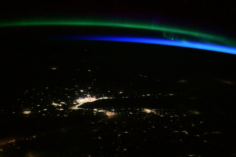 Pour finir cette promenade nocturne, Thomas Pesquet a saisi les lumières vertes d’une belle aurore boréale qui se produit lors de la rencontre des particules du vent solaires avec la haute atmosphère de la Terre, généralement entre 120 et 180 km d’altitude, soit bien en-dessous de celle de l’ISS. Puis, encore en dessous, dans une atmosphère terrestre calme, les lumières bleutées du jour se levant poignent à l’horizon le long de la courbure de la Terre : l’aube se prépare pour un jour nouveau…