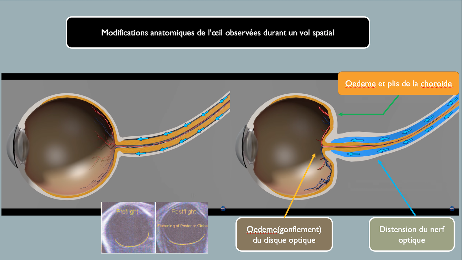 L’impact des séjours spatiaux sur la santé des astronautes est étudié depuis le début des vols spatiaux. La multiplication des vols de longue durée et l’apport de l’imagerie médicale à bord des stations orbitaux ont permis d’identifier différentes modifications physiologiques, dont certaines impactent la fonction visuelle. Ce phénomène est appelé VIIP ou Visual Impairment / Intracranial Pressure (trouble de la vue résultant du changement de pression intra-cranienne).
