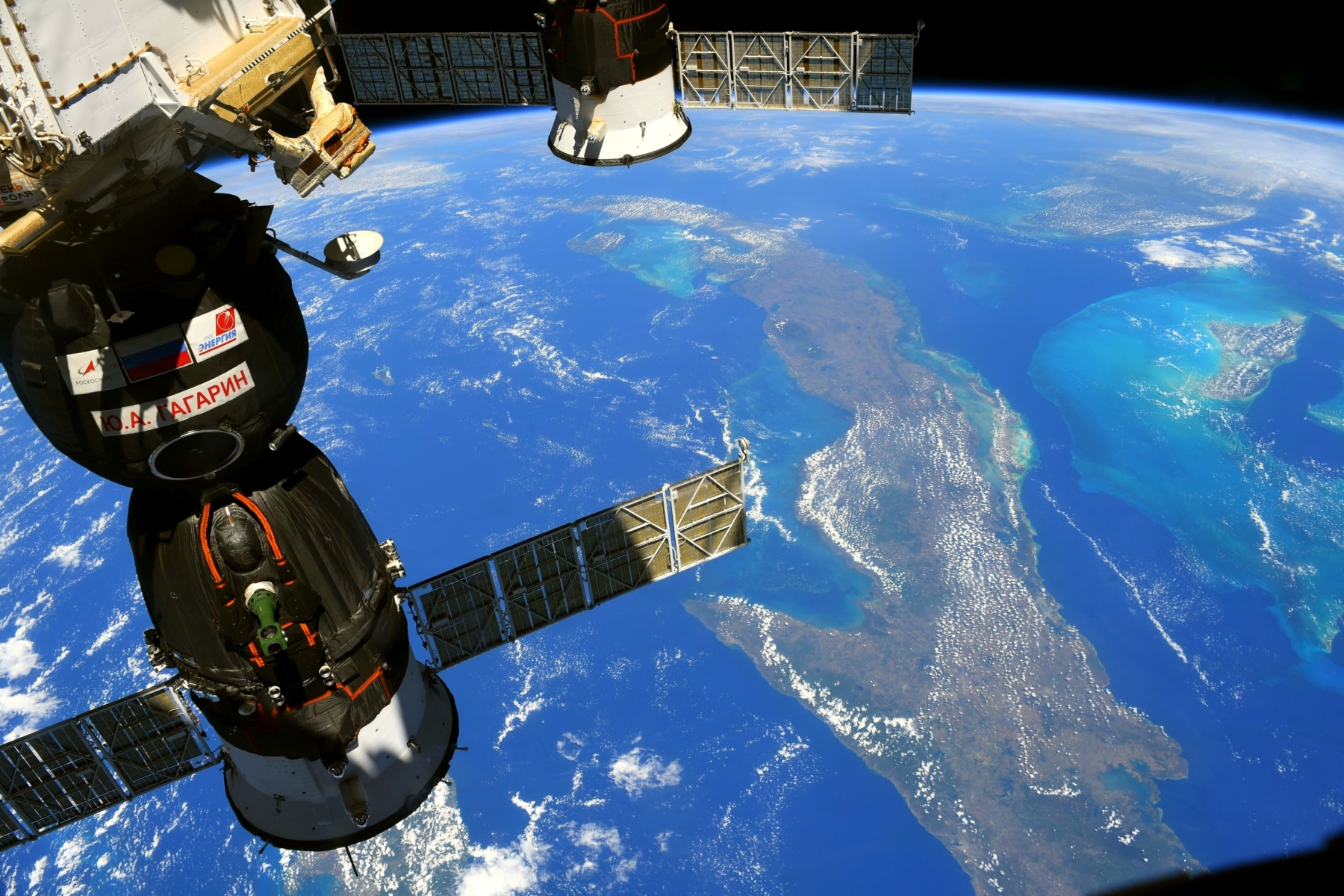 Entre Jamaïque et Bahamas, nous sommes au-dessus de l’île de Cuba (111.000 km² et 11 millions d’habitants), de sa capitale, la Havane, et de la ville portuaire Santiago de Cuba ! La presque totalité de l’île est d’ailleurs visible sur le cliché de Thomas ; il ne manque que la pointe orientale (non visible, mais située vers le coin bas droite). A la confluence de la mer des Caraïbes, du golfe du Mexique et de l’océan Atlantique, Cuba est la plus grande des îles des Antilles. On retrouve d’ailleurs facilement sur la photographie la pointe du Mexique et le Yucatán dont les villes de Mérida et de Cancun (angle haut à gauche), les Îles Caïmans (au milieu à gauche), la pointe Ouest de la Jamaïque partiellement cachée par le Soyouz “Gagarine” (bas gauche), la pointe Sud de la péninsule de Floride avec les villes de Miami, Tampa et Orlando (haut à droite) et les Bahamas (au milieu à droite), même si Nassau est hors du champs.