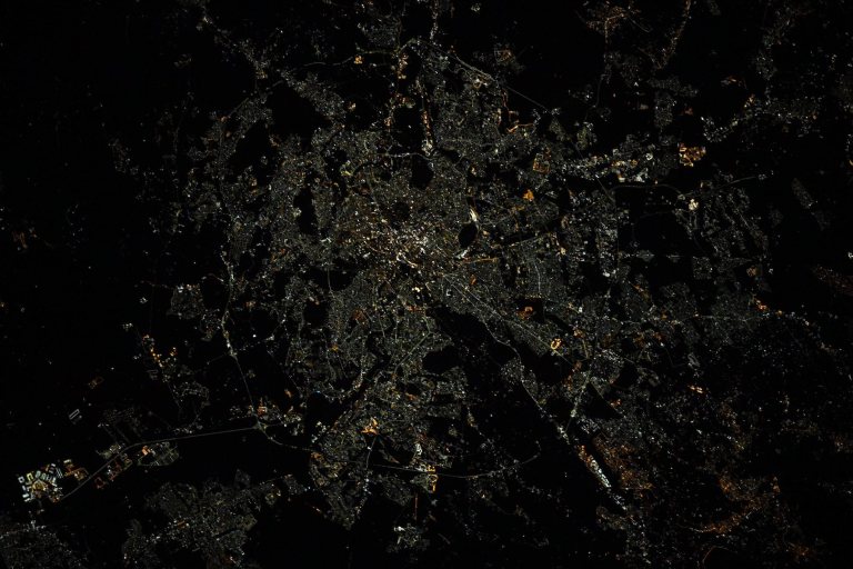 Nous sommes en effet au-dessus de Rome, capitale de l’Italie. C’est l’une des plus vieilles villes du monde occidentale, véritable phare de la connaissance et de la démocratie ; nous contemplons plus de 2.800 ans d’histoire ! La ville se situe au centre de la péninsule italienne, sur le littoral de la mer Tyrrhénienne que l’on devine à peine car plongée dans la nuit noire sur le côté gauche du cliché, juste au bord de l’aéroport international Léonard de Vinci dont les infrastructures aéroportuaires (à l’exception des pistes d’envol) sont très illuminées la nuit, dans le coin bas à gauche.
