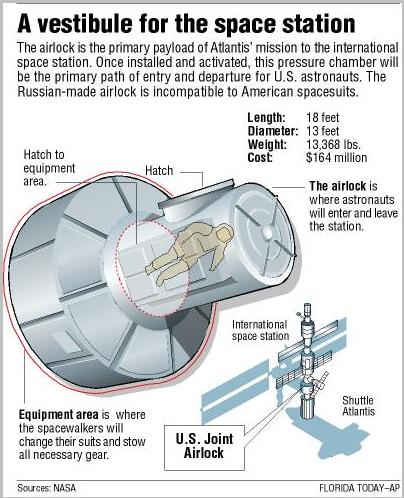 Seulement, voilà, si les scaphandres des astronautes avaient aussi la même pression d’air interne, les extrémités (les doigts des mains) des gants seraient trop rigides et ils ne pourraient pas manipuler leurs outils. Il faut baisser la pression interne drastiquement (approx 1/3). Mais à cette pression, le cerveau n’est pas assez oxygéné. Qu’à cela ne tienne on remplace l’air par de l’Oxygène pur. Mais là aussi, problème, nous ne pouvons pas passer directement de l’air ambiant à l’oxygène pur, sinon on risquerait ce que risque les plongeurs. Il faut une période d’adaptation de quelques heures pendant lesquelles on va s’habituer à respirer de l’Oxygène pur. C’est le rôle du module-sas Quest. Si cette ventilation forcée n’était pas faite, un accident identique aux accidents de décompression se produirait à l’extérieur, des bulles d’Azote se formeraient dans le sang. Les réserves pour une EVA peuvent atteindre une dizaine d’heures.