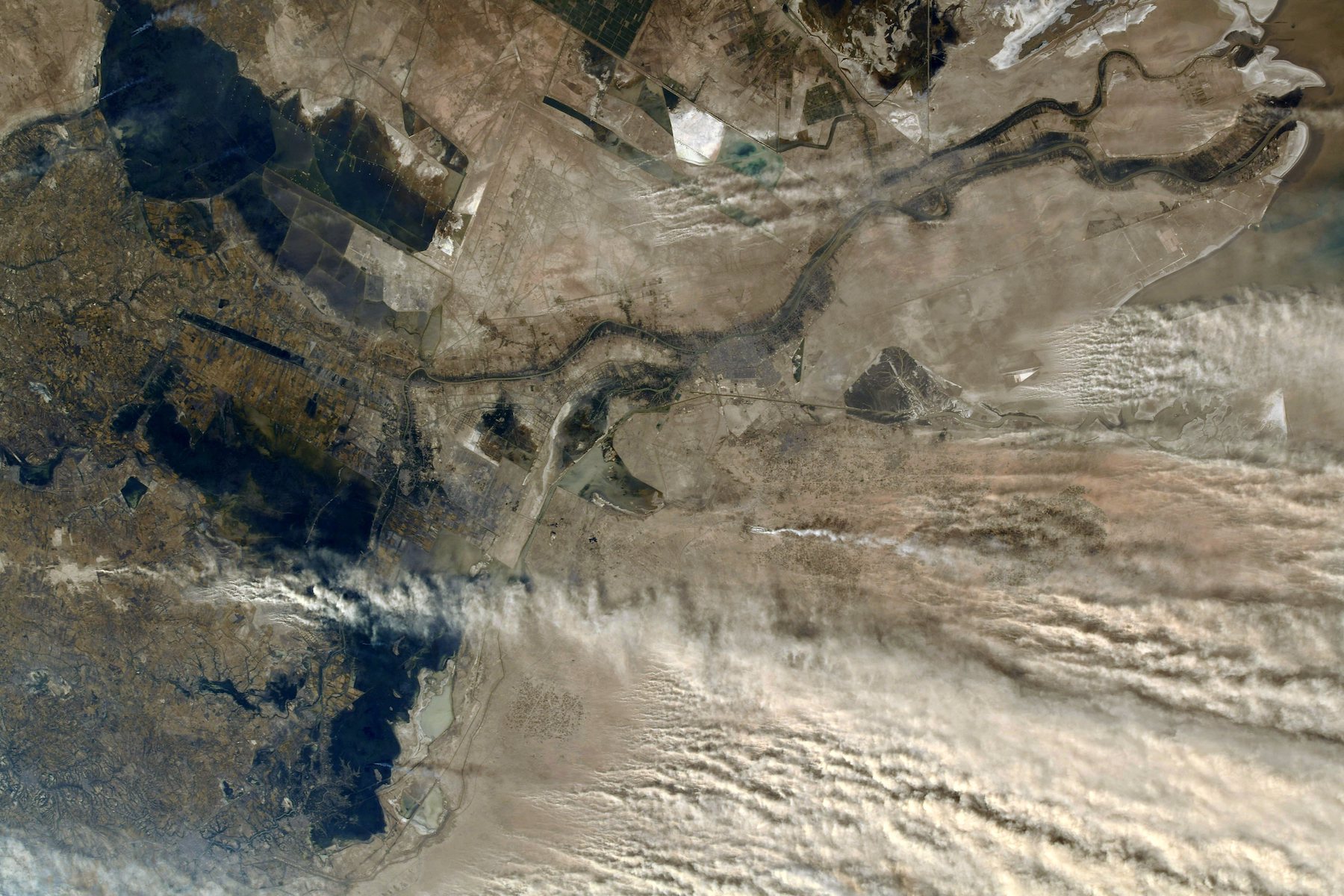 Précisons également que la région de Bassorah possède un sous-sol riche en pétrole, ce qui a attisé les convoitises tout au long du XXè siècle. On retrouve sur le cliché de Thomas quelques implantations de puits de forage et quelques raffineries trahies notamment par des panaches de fumées blanches… à ne pas confondre avec la tempête jaunâtre faite de poussières désertique, qui faisait rage depuis quelques jours au moment de la prise de vue, et que l’on aperçoit très bien dans le coin bas droit de l’image.