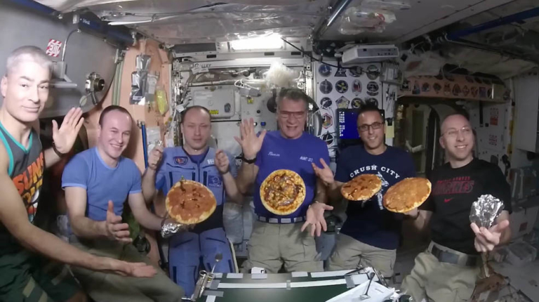 Mais un grand jour de gloire s’est produit pour les premières pizzas à bord de l’ISS, cela a donné lieu à une super pizza-party comme on le voit sur cette photo.