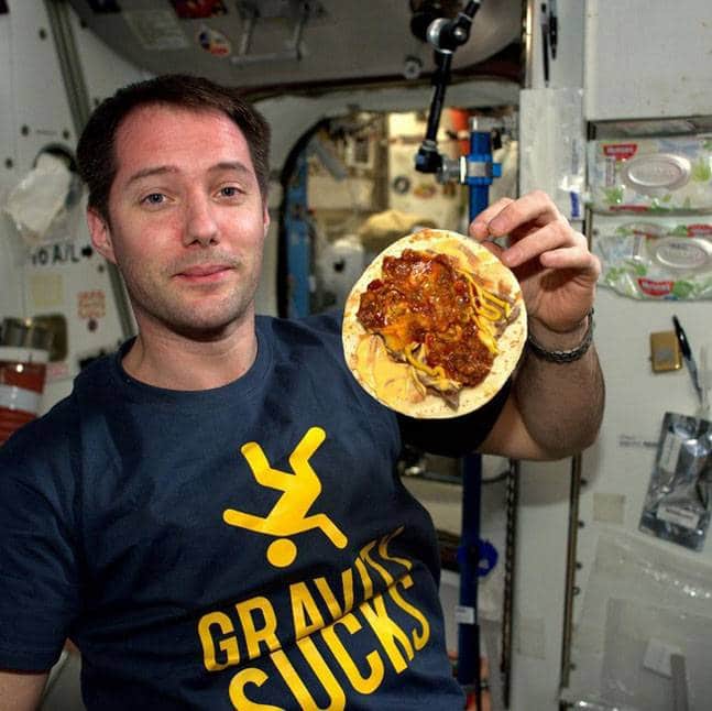 Ici on voit notre ami Thomas en train de se préparer une tortilla « spéciale ». Crédit : NASA