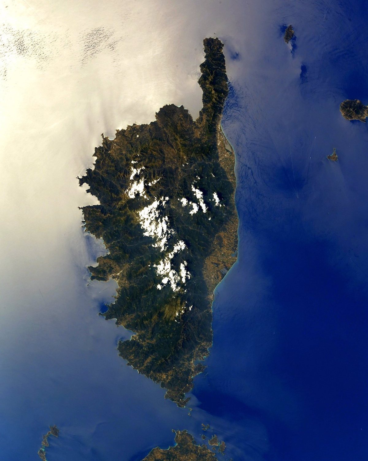 Thomas Pesquet nous propose cette vue avec le commentaire suivant : “La Corse en majesté. C’est toujours surprenant de réaliser qu’elle est plus proche de l’Italie que de l’Hexagone – à force de regarder les cartes de la météo ou celles des livres d’histoire géo où on la rapproche du continent, j’ai grandi pensant qu’elle était à 200 m au large de Nice, et quelle ne fut pas ma surprise de constater qu’elle a une sœur proche, la Sardaigne, à une encablure au sud 🙂 Cette photo illustre parfaitement ce que les astronautes aiment photographier depuis l’espace : des paysages reconnaissables au 1er coup d’œil, une verticale presque parfaite, et le reflet du soleil sur la mer ”.