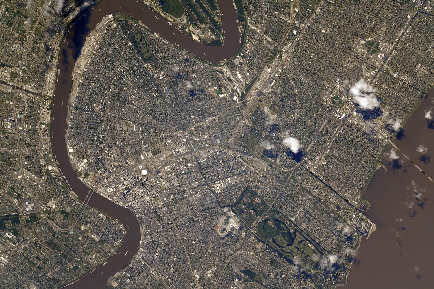 Nous sommes au-dessus de Fontainebleau, de Gentilly, du Faubourg Marigny, du Faubourg Lafayette, du Faubourg Delassize, du Faubourg Livaudais, de Bayou Saint-Jean et de Saint-Claude ! C’est en plein cœur de la Nouvelle-Orléans, la plus grande ville de l’Etat de Louisiane, aux Etats-Unis. La Nouvelle-Orléans fait face au golfe du Mexique, et se trouve en plein dans la plaine deltaïque du Mississippi, une immense zone alluviale, tout près de sa longue embouchure !