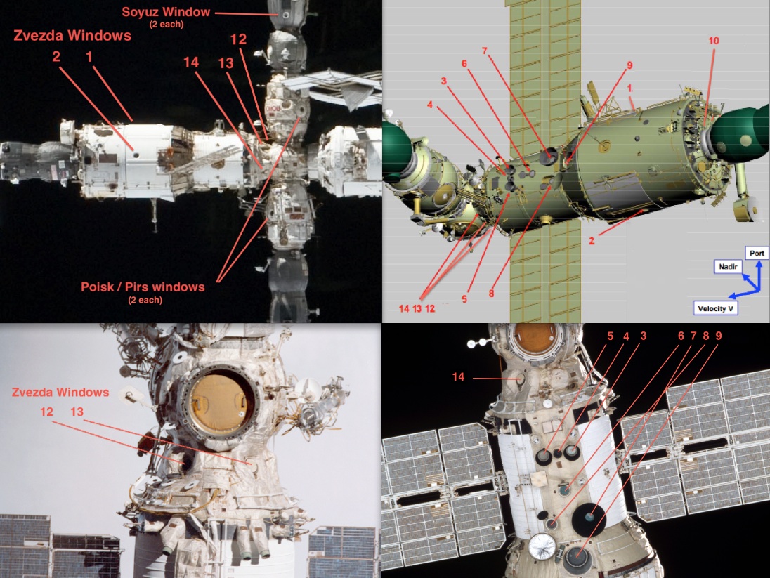 es modules russes sont aussi équipés de nombreuses petites ouvertures et hublots permettant d’étudier l’extérieur. On le voit sur cette photo représentant toutes les ouvertures de ces modules. Depuis quelques temps, on note aussi une fuite d’air minime mais constante provenant du module Zvesda, on ne l’a pas encore trouvée, mais à priori ce n’est pas dangereux pour le moment. Néanmoins il va falloir y remédier. Ces modules russes sont parmi les plus anciens de l’ISS, ils commencent à dater….Tous ces modules sont opérés par l’agence Russe Roscosmos.