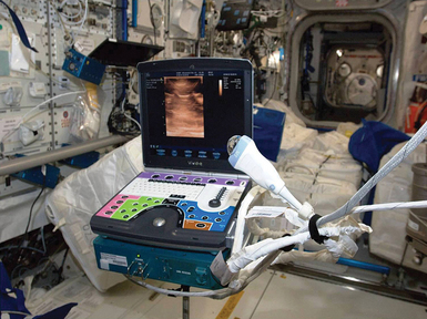 La seule technique utilisée actuellement dans l’espace de manière courante reste donc l’échographie. Celle-ci présente l’avantage d’être non irradiante : sa technique est basée sur les ultra-sons. Les échographes ont connu une vraie évolution technologique et ne sont actuellement pas beaucoup plus volumineuse qu’un ordinateur portable.