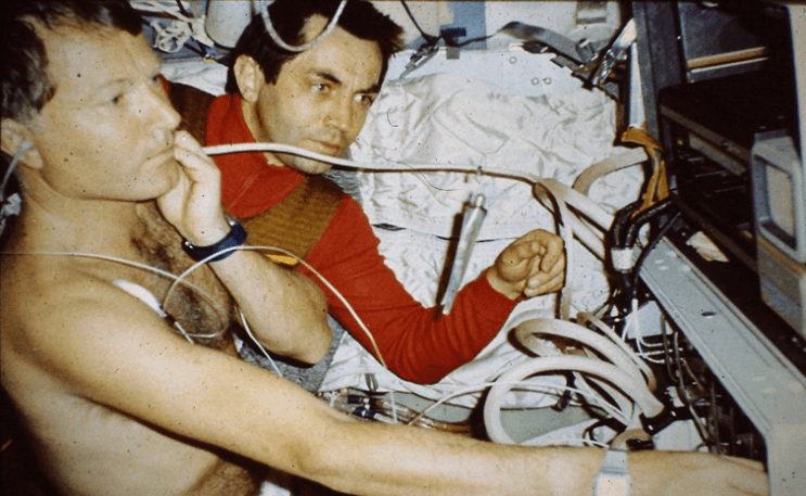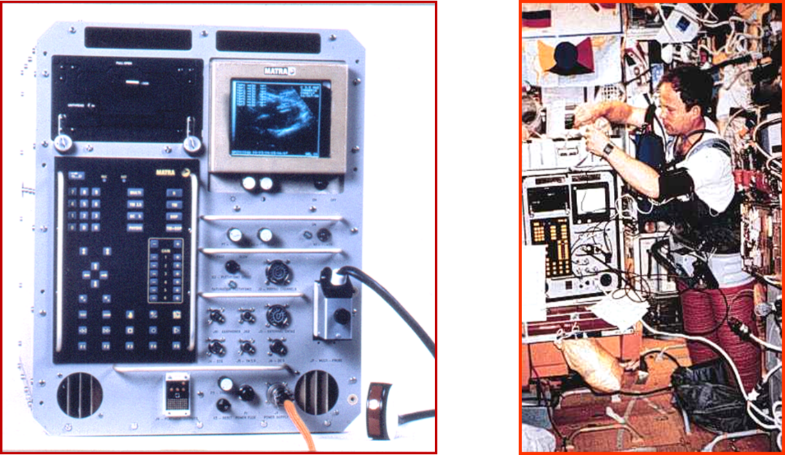 L’intérêt de l’échographie dans l’espace n’est pas nouveau : c’est Jean-Loup Chrétien, en 1982, lors du vol franco-soviétique PVH, qui embarqua le premier un échographe autour de la Terre, à bord de la station soviétique Saliout 7. La qualité du matériel français fut reconnue de manière internationale, puisque le cardiologue-cosmonaute Oleg Atkov poursuivît les études dans l’espace grâce à cet échographe bien après la fin de mission de notre astronaute. Puis, trois ans plus tard, un autre échographe français vola également à la demande de la Nasa à bord de la navette Discovery lors du vol STS-51G de Patrick Baudry.
