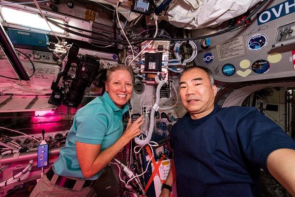 Les cristaux de semi-conducteurs sont des composants essentiels dans toutes les puces électroniques, les capteurs et les appareils de communication sans fil. Noguchi conduit l’expérience SUBSA dans la boîte à gant en micropesanteur pour tester de nouvelles méthodes de production de cristaux semi-conducteurs. Les résultats de ce travail pourraient améliorer la qualité des puces électroniques utilisées dans les appareils des consommateurs sur Terre.
