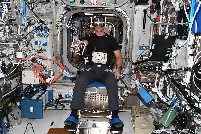 Expérience Grasp réalisée en position assise par Thomas Pesquet. Crédit : ESA/NASA