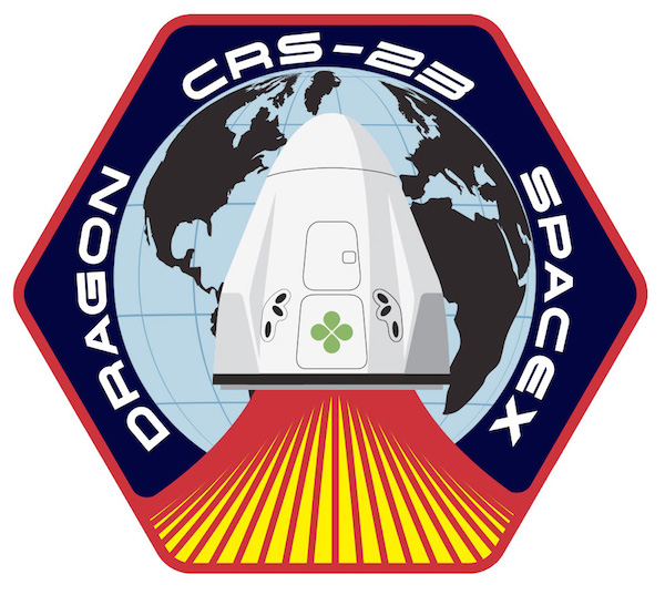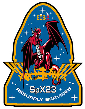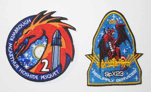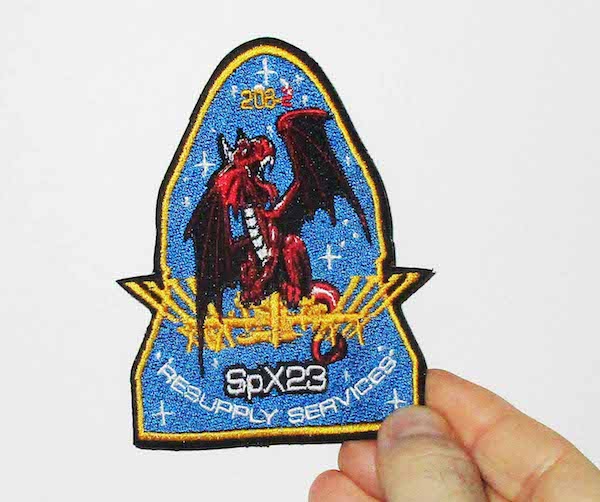 Comme les missions spatiales habitées, un logo est dessiné par la NASA pour représenter la mission qui est décliné sous différentes formes (publications, autocollants, patchs…). C’est le deuxième vaisseau de ravitaillement SpaceX qui arrive pendant la mission Alpha de Thomas Pesquet, on peut donc ajouter le patch à notre collection (je reparlerai bientôt du premier, CRS-22).
