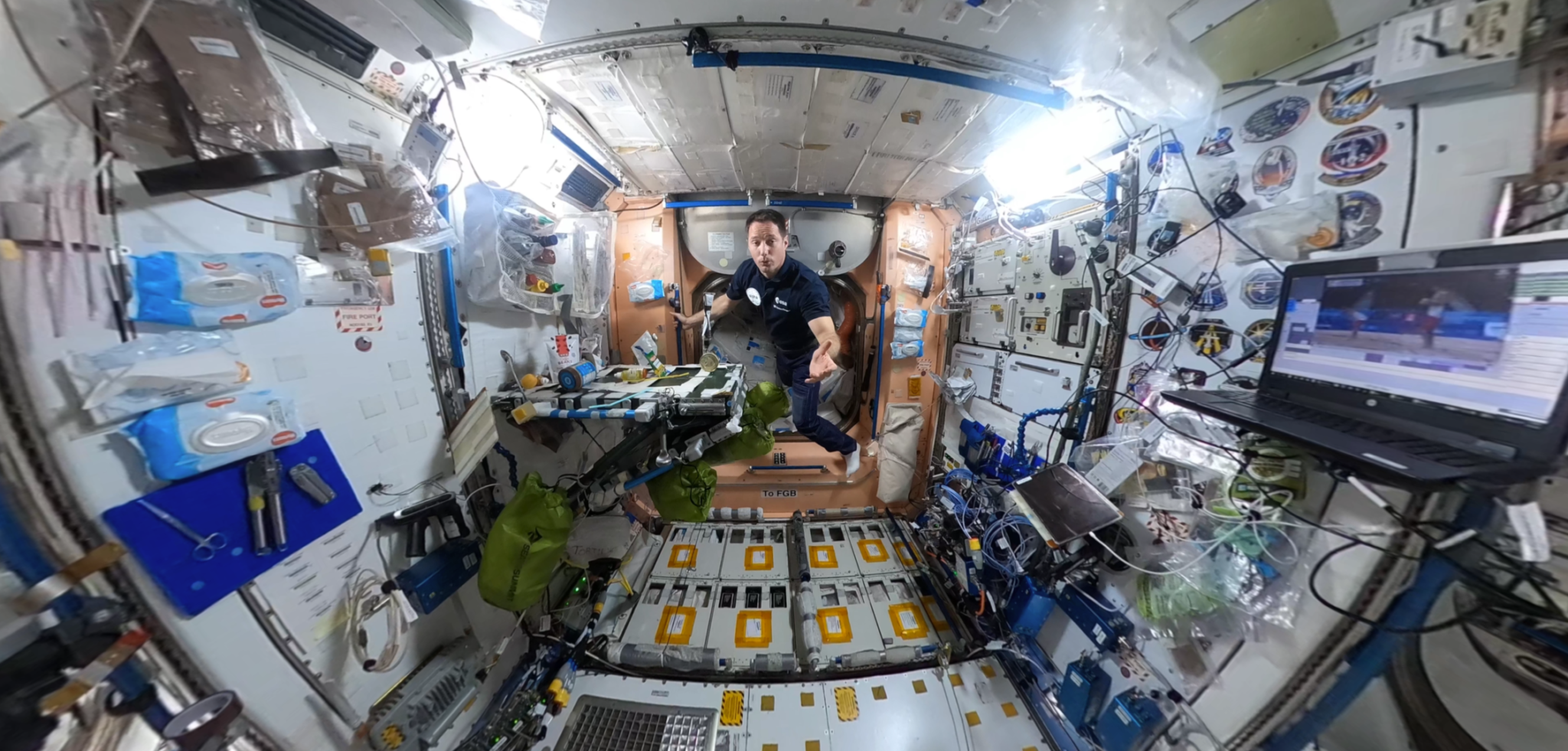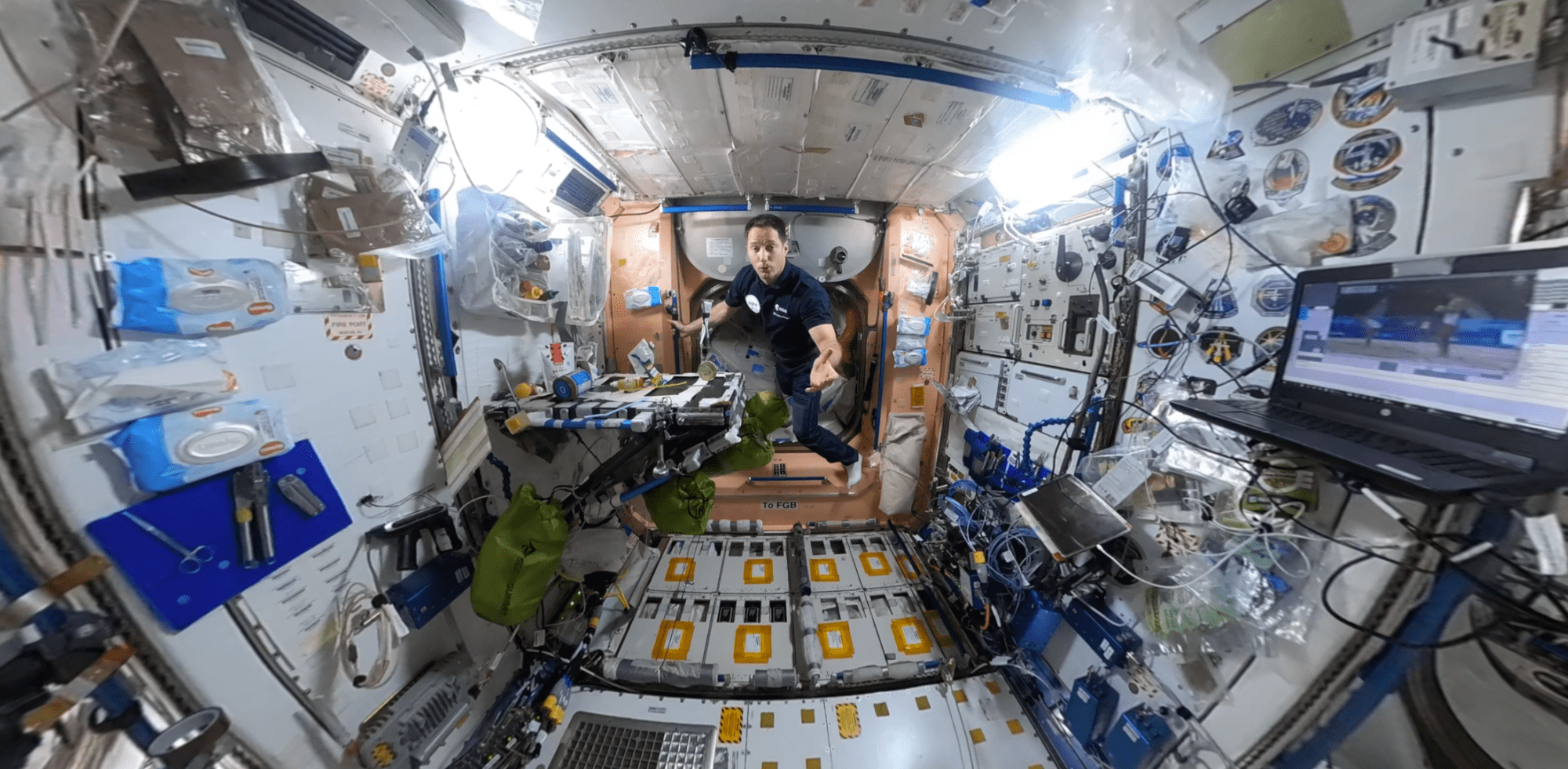 En cliquant et déplaçant votre souris sur l’écran d’un ordinateur du bureau ou avec votre doigt sur un smartphone, vous pouvez à tout moment naviguer dans l’image et suivre Thomas Pesquet durant sa visite.