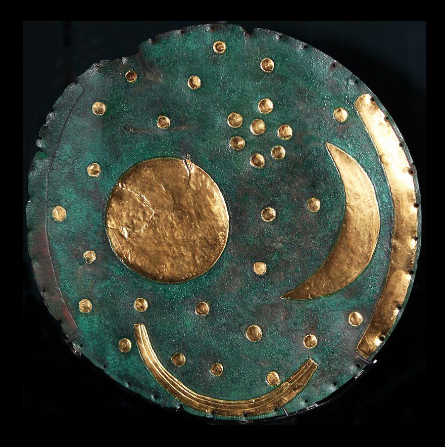 On y voit un croissant de Lune et ce qui semblerait être, soit la pleine Lune, soit le Soleil. Et un groupe de sept étoiles qui pourrait être la constellation des Pléiades.