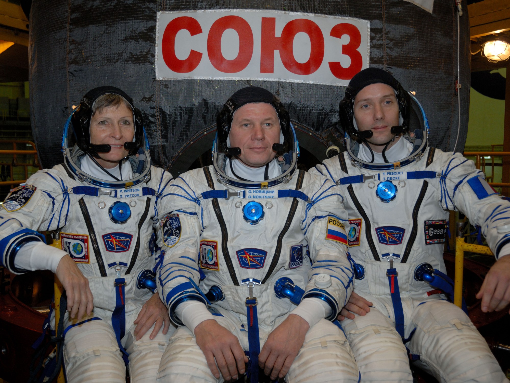 A ses côtés, le cosmonaute russe Oleg Novitski, commandant de bord qui effectuait alors son deuxième vol spatial, et l’astronaute américaine Peggy Whitson, qui allait battre un nombre impressionnant de records à l’occasion de son troisième séjour sur orbite.