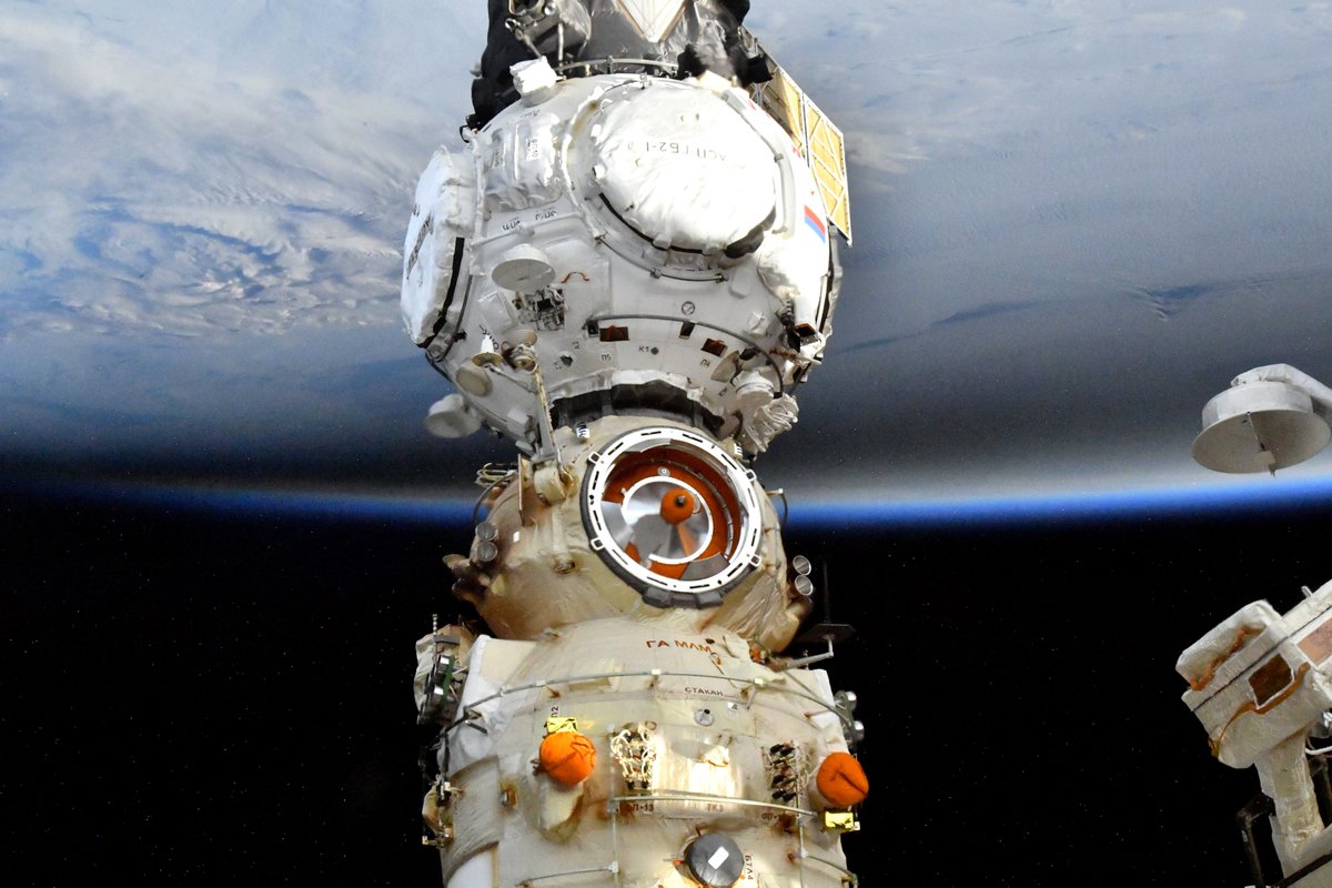 Au premier plan se dressent les deux derniers modules russes rattachés à la station : le laboratoire Nauka (un peu jaune), arrivé le 29 juillet dernier, et le nœud d’amarrage Pritchal (très blanc), amarré depuis le 26 novembre.