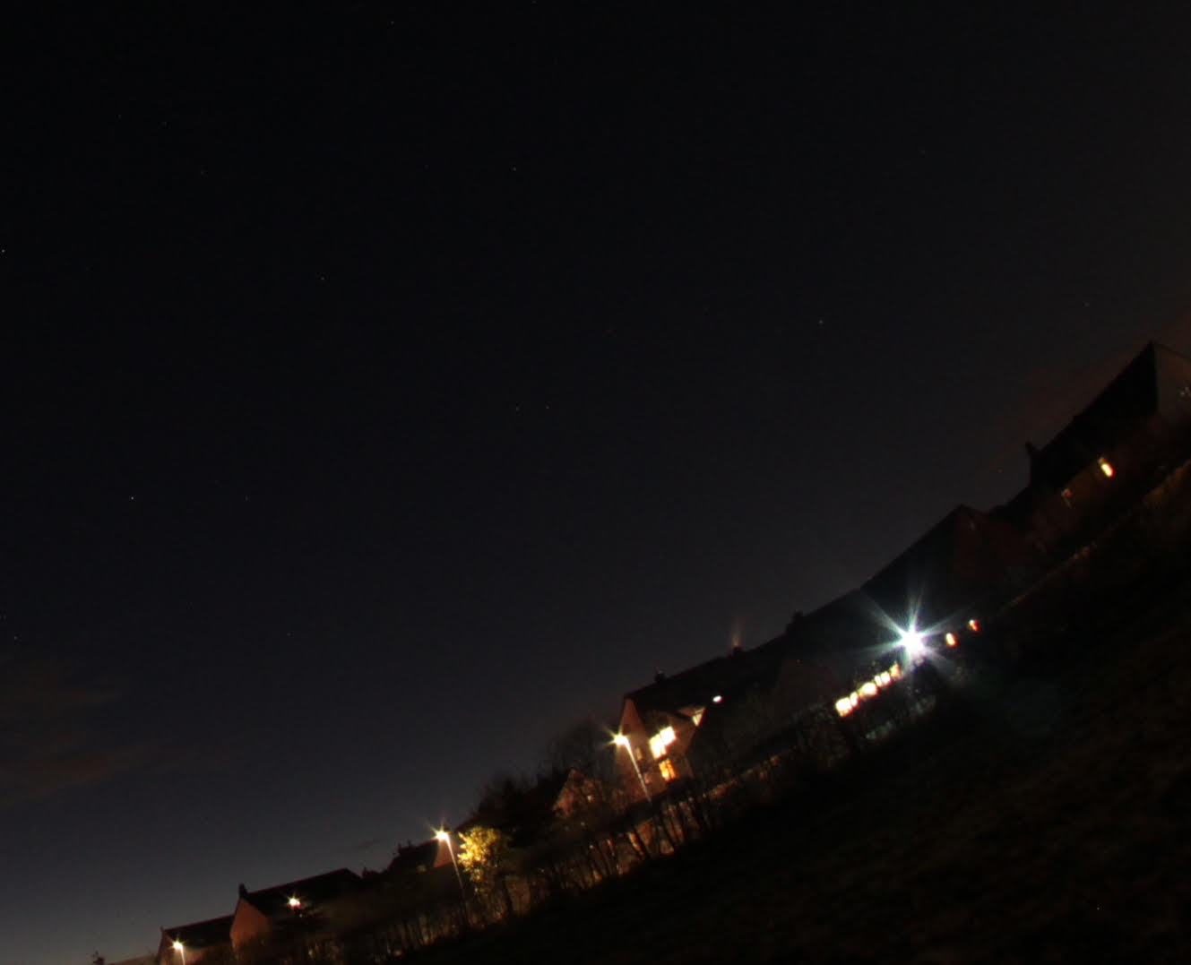 On voit à gauche Jupiter, Saturne en dessous et Vénus près de l’horizon. Les lumières rouges au sol à gauche sont des éoliennes. Il y a quelques pixels rouges chauds sur la photo.
