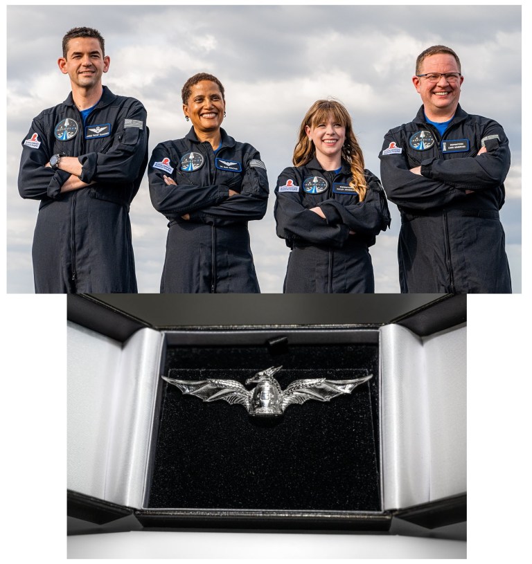Pour le vol touristique Inspiration4 de SpaceX où quatre touristes ont volé en orbite à bord du vaisseau Crew Dragon (plus haut que l’ISS !), le titre conventionnel d’astronaute ne leur est pas attribué. Ce sont des passagers SpaceX. Mais SpaceX a créé spécialement pour eux un insigne spécial, avec un… dragon.