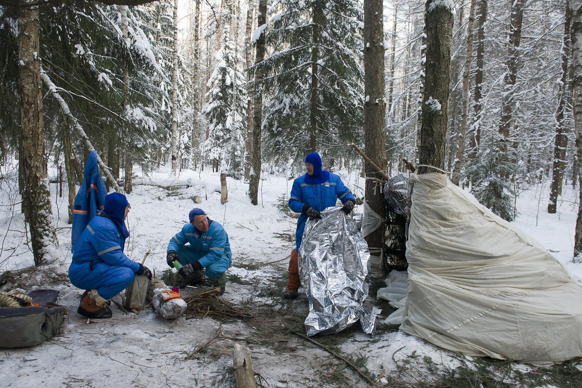 Les stages de survie organisés par l’Agence spatiale russe, simulant un atterrissage au milieu d’une forêt enneigée, sans que les équipes de sauvetage ne puissent intervenir immédiatement : les cosmonautes doivent se préparer un habitat et même trouver des solutions pour évacuer un membre d’équipage blessé…