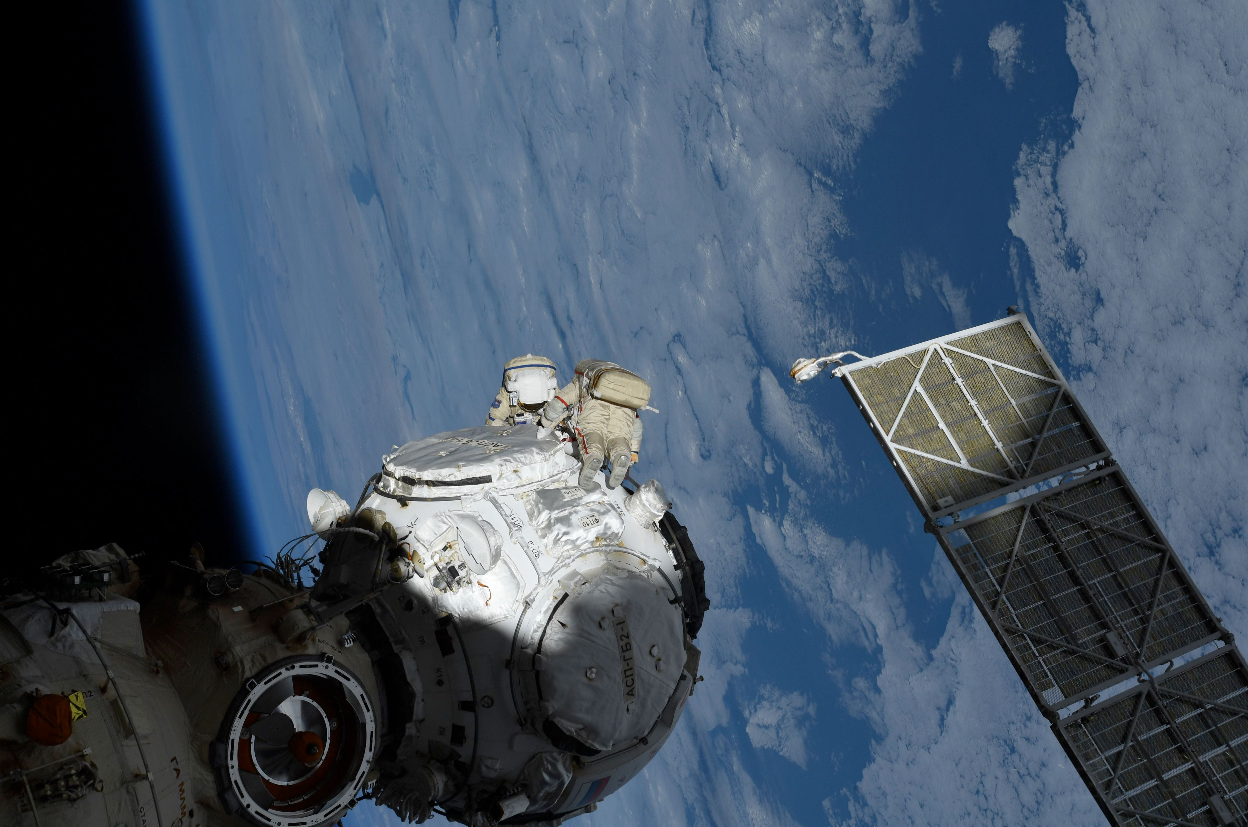 Pour Anton Chkaplerov, c’était la troisième sortie (soit un total de 21 heures et 39 minutes), et pour Piotr Doubrov, la quatrième (29 heures et 49 minutes).