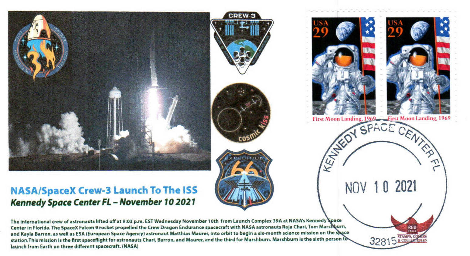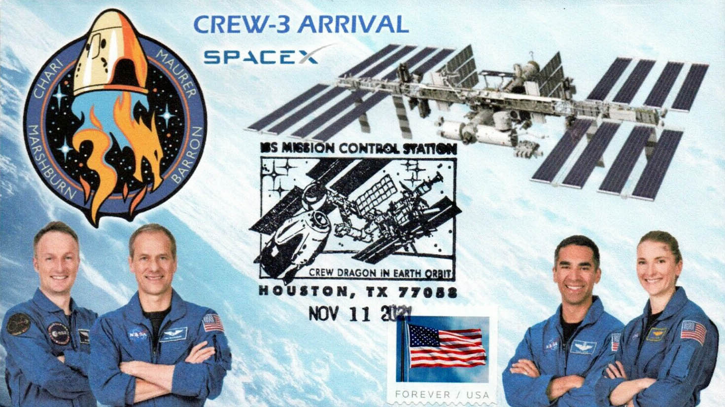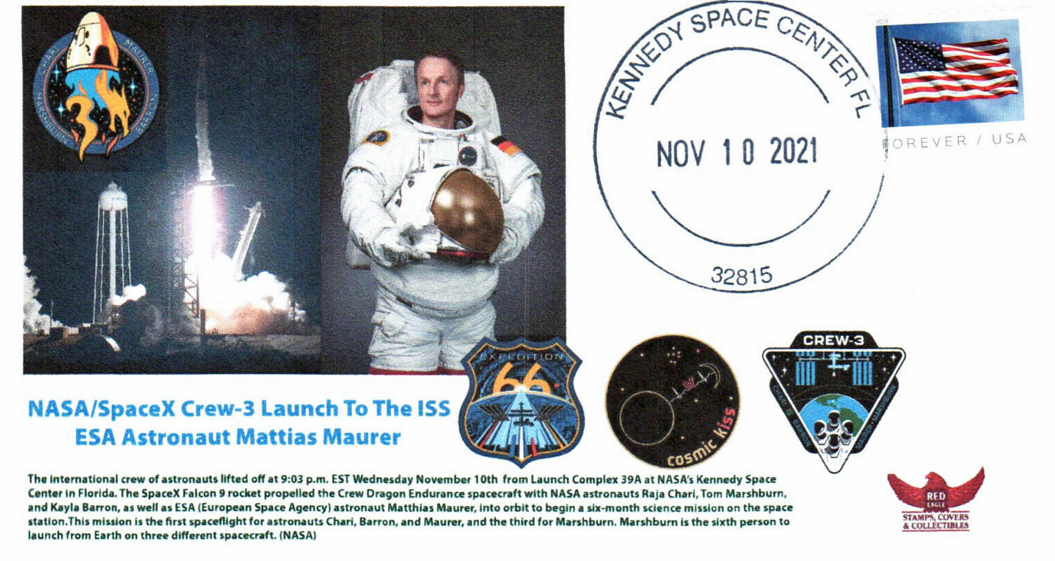 Pour ce nouveau rendez-vous du Coin du collectionneur, on va s’intéresser à la mission Crew 3 jusqu’à son amarrage le 11 novembre 2021. Et même si ce n’est pas toujours facile (et possible parfois), avec un peu de volonté et de détermination, on peut arriver au genre de suivi de mission que je vais vous montrer… Un grand merci d’abord et surtout au négociant américain qui essaie de faire au mieux pour un suivi très complet.