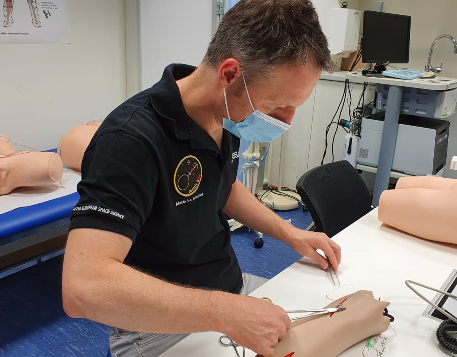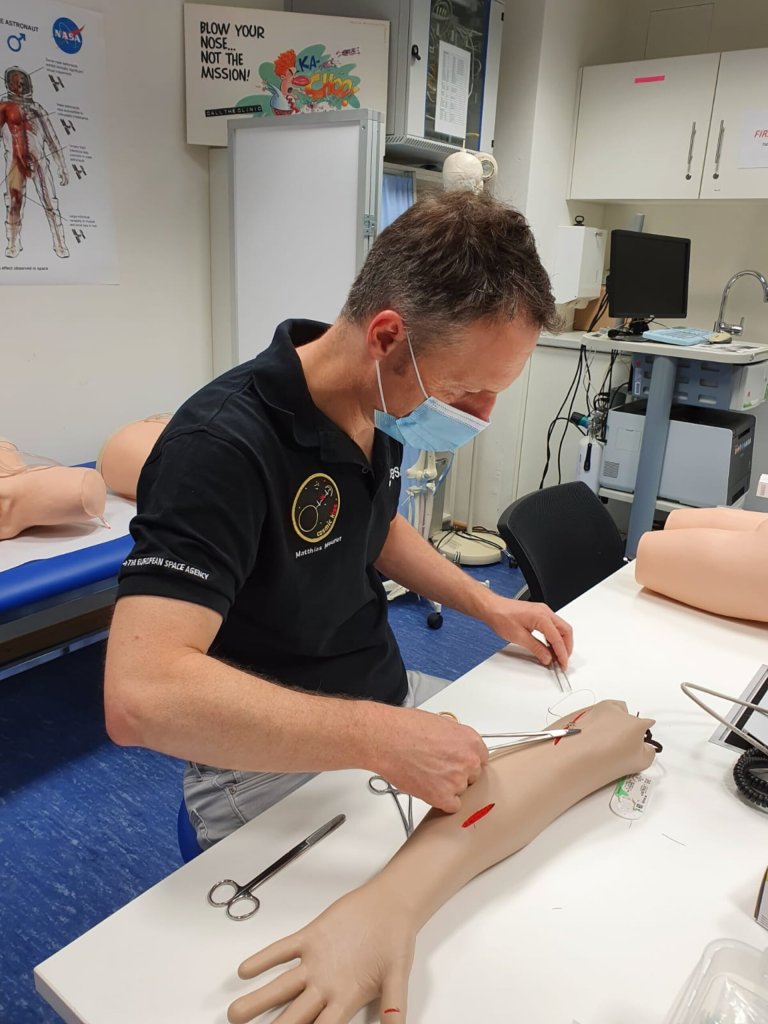 Matthias Maurer et ses collègues de la promotion des astronautes ESA de 2009 ont ainsi bénéficié d’une formation médicale poussée durant leur entraînement de base dispensé au centre des astronautes à Cologne, en Allemagne. En plus d’une formation théorique et d’exercices sur des mannequins, des stages pratiques ont également été organisés dans des hôpitaux à Cologne, afin de se confronter à de « vrais » patients et développer leur savoir-faire.