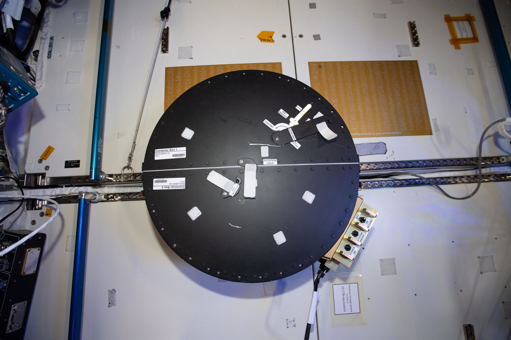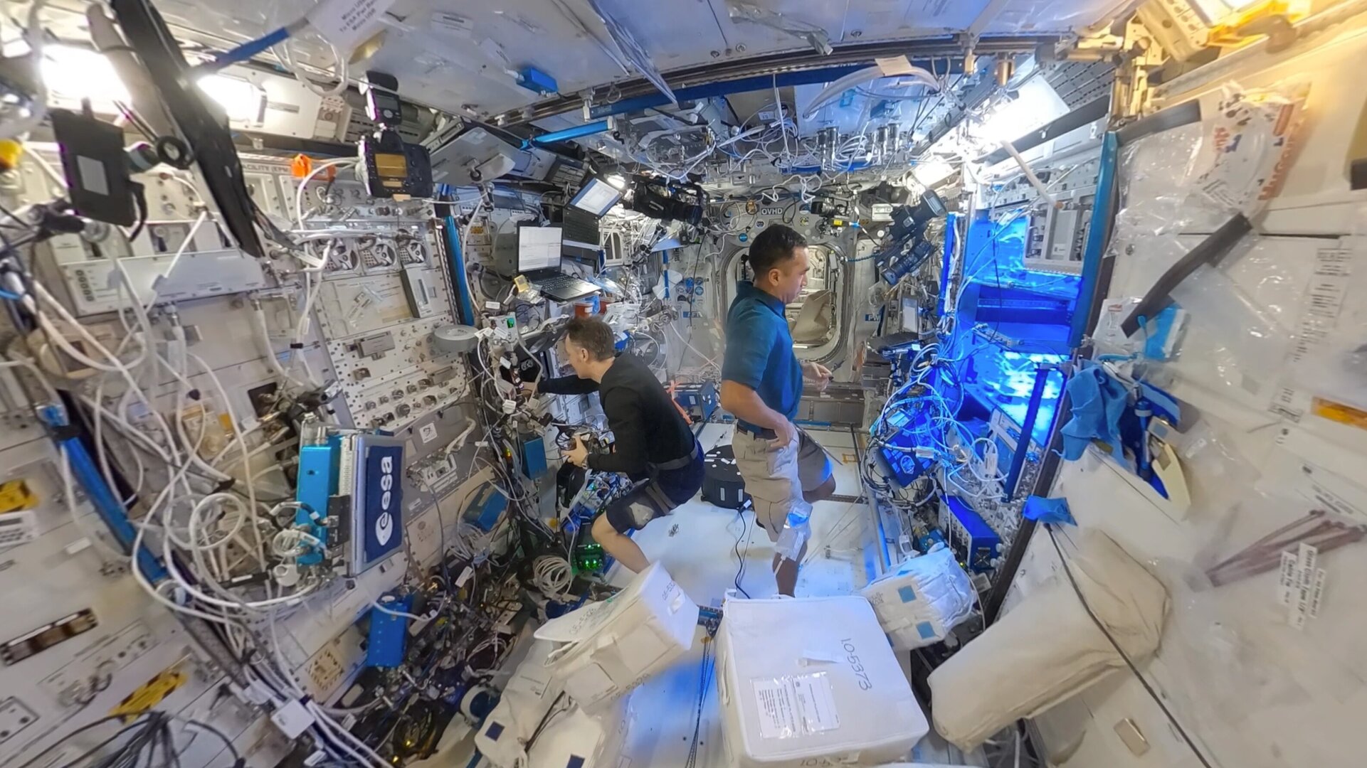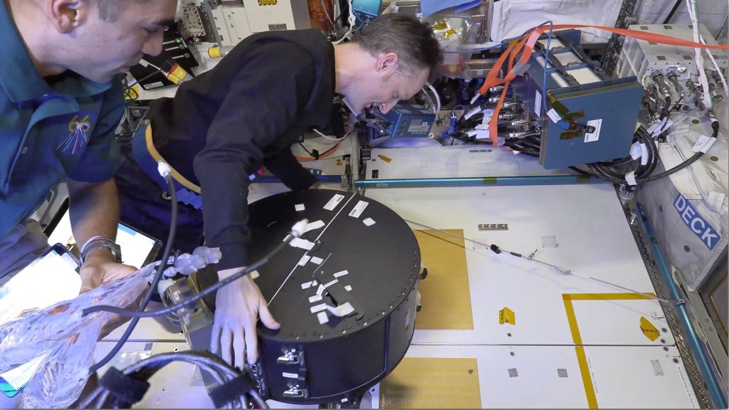 Sur ce timelaps à 360°, Matthias Maurer apparaît en short et à gauche de l’image, et l’expérience Fluidics se trouve dans la centrifugeuse noire posée au « sol ». A leurs côtés, l’astronaute américain Raja Chari s’occupe pour sa part de l’entretien la serre de culture Veggie (Vegetable Production System) de la Nasa.