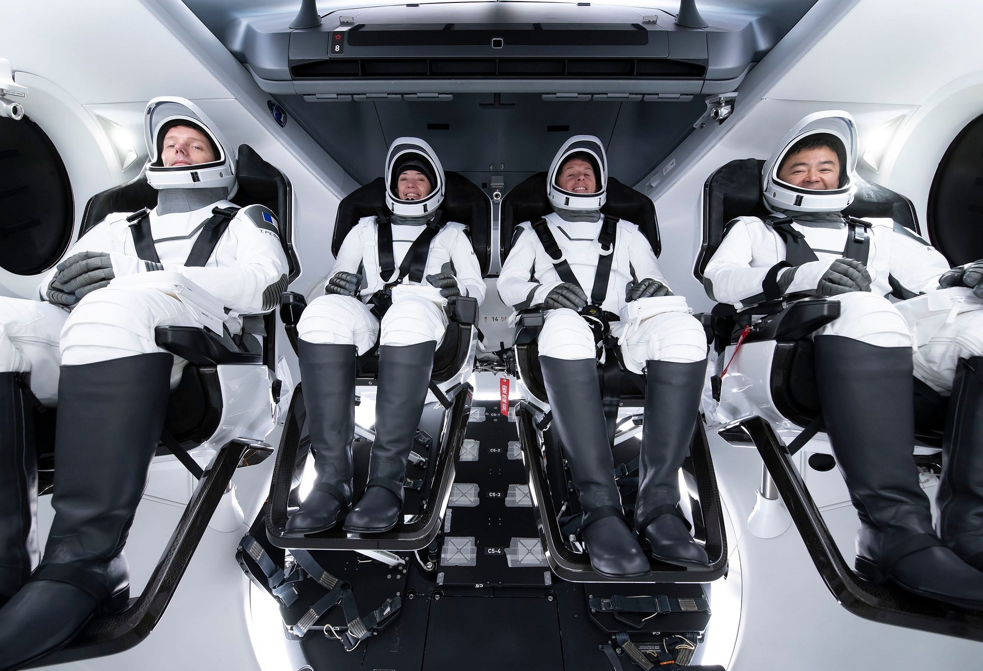Les scaphandres sont assez seyants, c’est une volonté de SpaceX que ce soit sympa, mais par contre, on ne peut pas l’enfiler tout seul, il faut être aidé par un ou par deux collègues – notamment pour l’enfiler au niveau de la poitrine : c’est super serré et, surtout en apesanteur, on ne peut pas se servir du poids des scaphandres pour le faire tomber sur les épaules, il s’enfile par le bas…