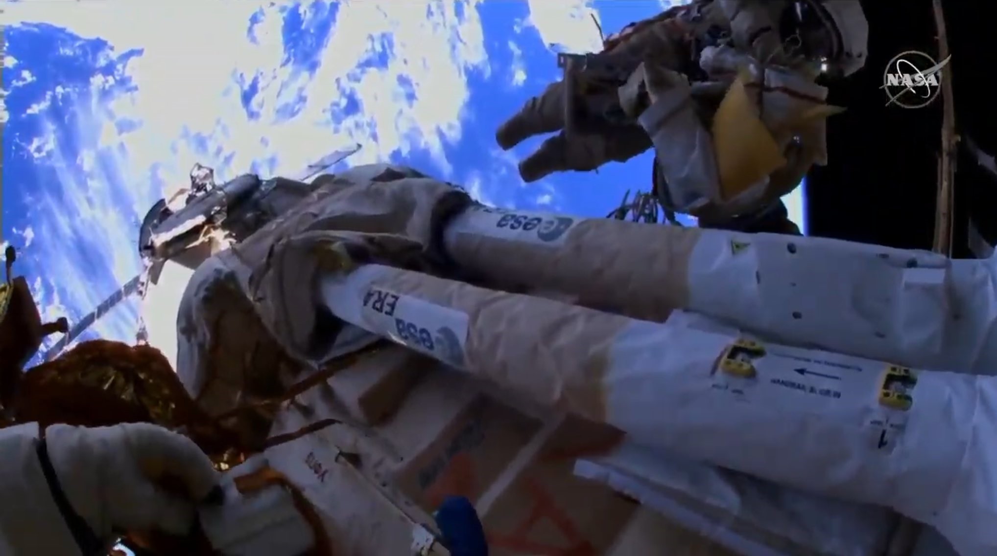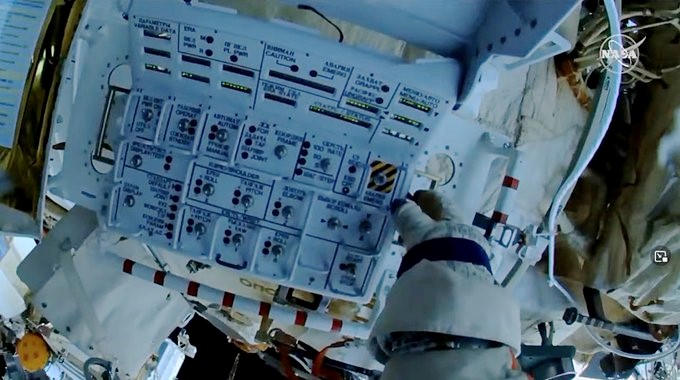 Après s’être déplacés vers le lieu d’intervention, les deux hommes ont commencé par installer et tester un panneau de contrôle appelé EMMI (External Man Machine Interface / Interface Externe Homme Machine), qui permettra de commander le bras depuis l’extérieur de la station.