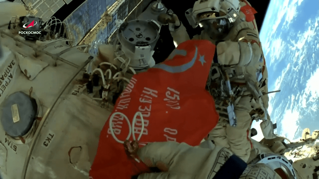 On notera également que les cosmonautes ont pris quelques instants, au bout de 7 heures de sortie, pour déployer une réplique de la « bannière de la victoire », placée au sommet du Reichstag lors de la prise de Berlin par l’Union Soviétique le 9 mai 1945, la date anniversaire et les festivités associées en Russie approchant.