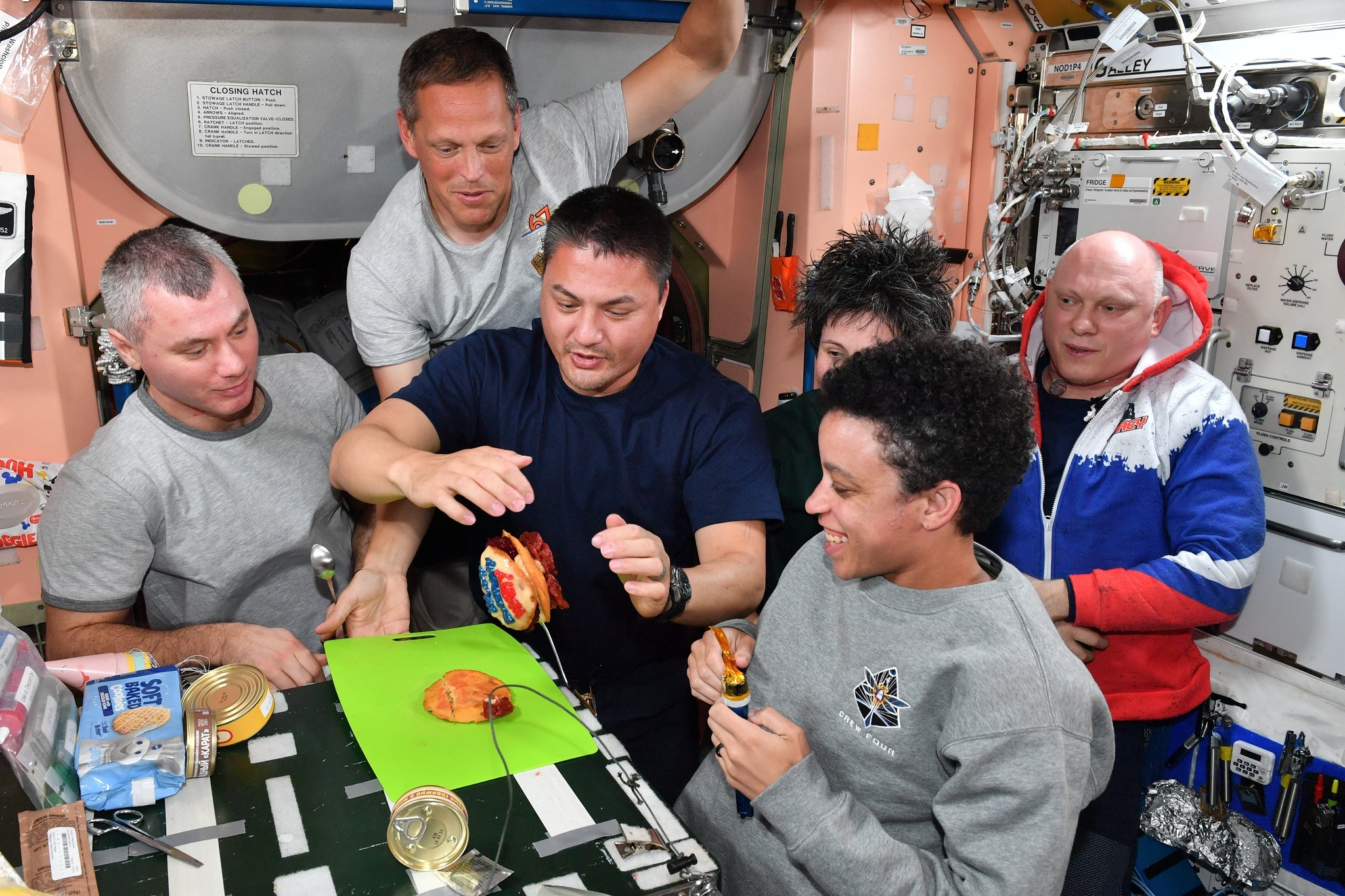 Pour l’occasion, tous les membres de l’Expedition 67 se sont rassemblés autour de la « table à manger » du module Unity (Node 1) de la station, et l’astronaute américain Kjell Lindgren avait préparé un petit gâteau d’anniversaire.