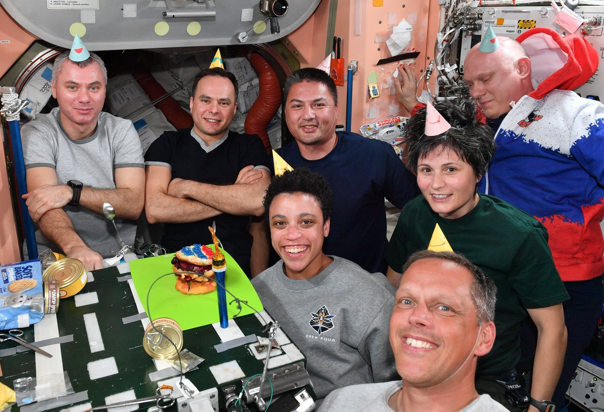 Pour l’occasion, tous les membres de l’Expedition 67 se sont rassemblés autour de la « table à manger » du module Unity (Node 1) de la station, et l’astronaute américain Kjell Lindgren avait préparé un petit gâteau d’anniversaire.