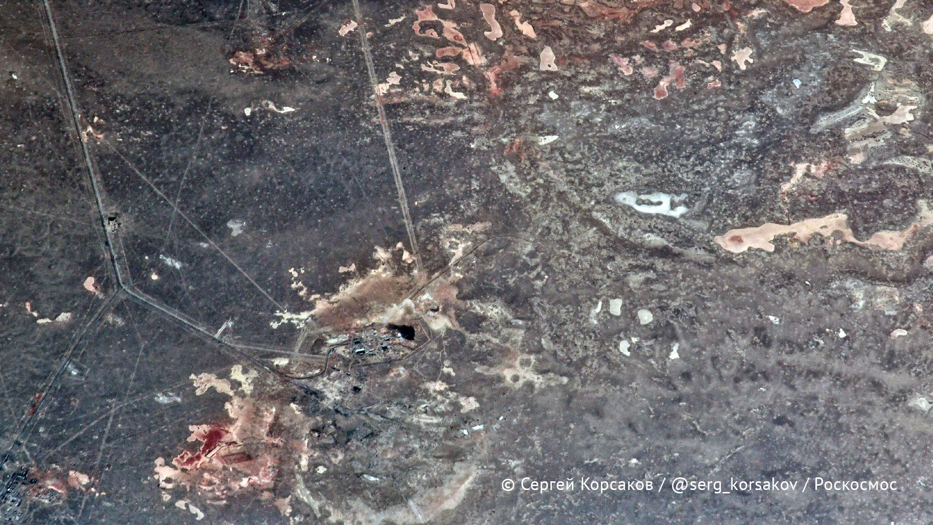 Sur son nouveau cliché, on distingue notamment le panache de fumée du lanceur Soyouz (et son ombre au sol), les différents bâtiments et réservoirs disséminés autour du pas de tir, ainsi que les voies d’accès à la zone 31 du cosmodrome, tracées en lignes parfaitement droites au milieu de la steppe.