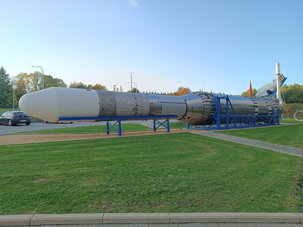 Devant l’entrée de l’Euro Space Center, entre autres petites maquettes de fusées du monde entier, trônent toujours un véritable étage de la fusée européenne Europa 2 (l’ancêtre du lanceur Ariane) et une maquette de feu le projet d’avion spatial européen Hermes.